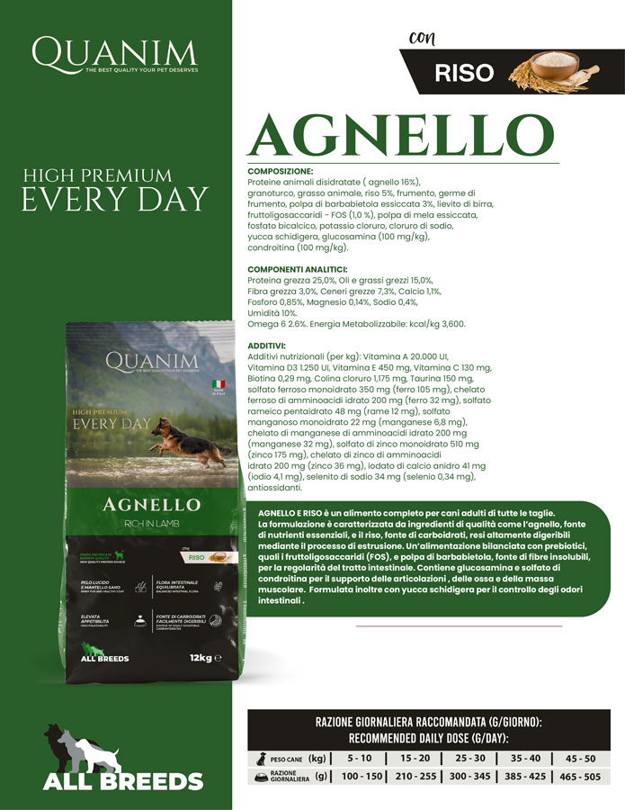COMPOSIZIONE: Proteine animali disidratate (agnello 16%), granoturco, grasso animale, riso 5%, frumento, germe di frumento, polpa di barbabietola essiccata 3%, lievito di birra, fruttoligosaccaridi (FOS) 1.0%, polpa di mela essiccata, fosfato bicalcico, potassio cloruro, cloruro di sodio, yucca schidigera, glucosamina (100 mg/kg), condroitina (100 mg/kg).